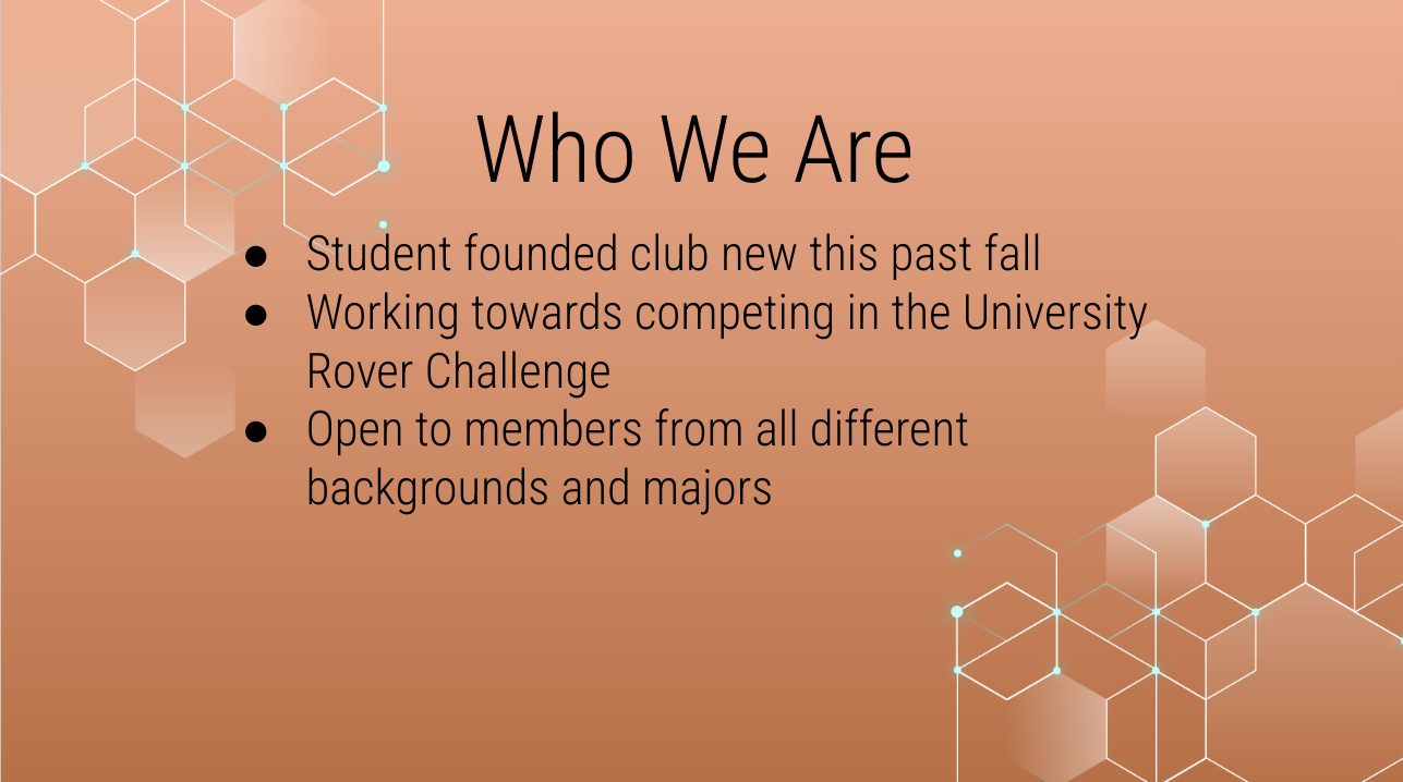 We are the robotics club at the University of Wyoming competing in robotics competitions nationwide. Our purpose is to allow students to apply their book knowledge and gain experience with reality. Our primary goal is to compete in the University Rover Competition (URC) by the Mars Society.